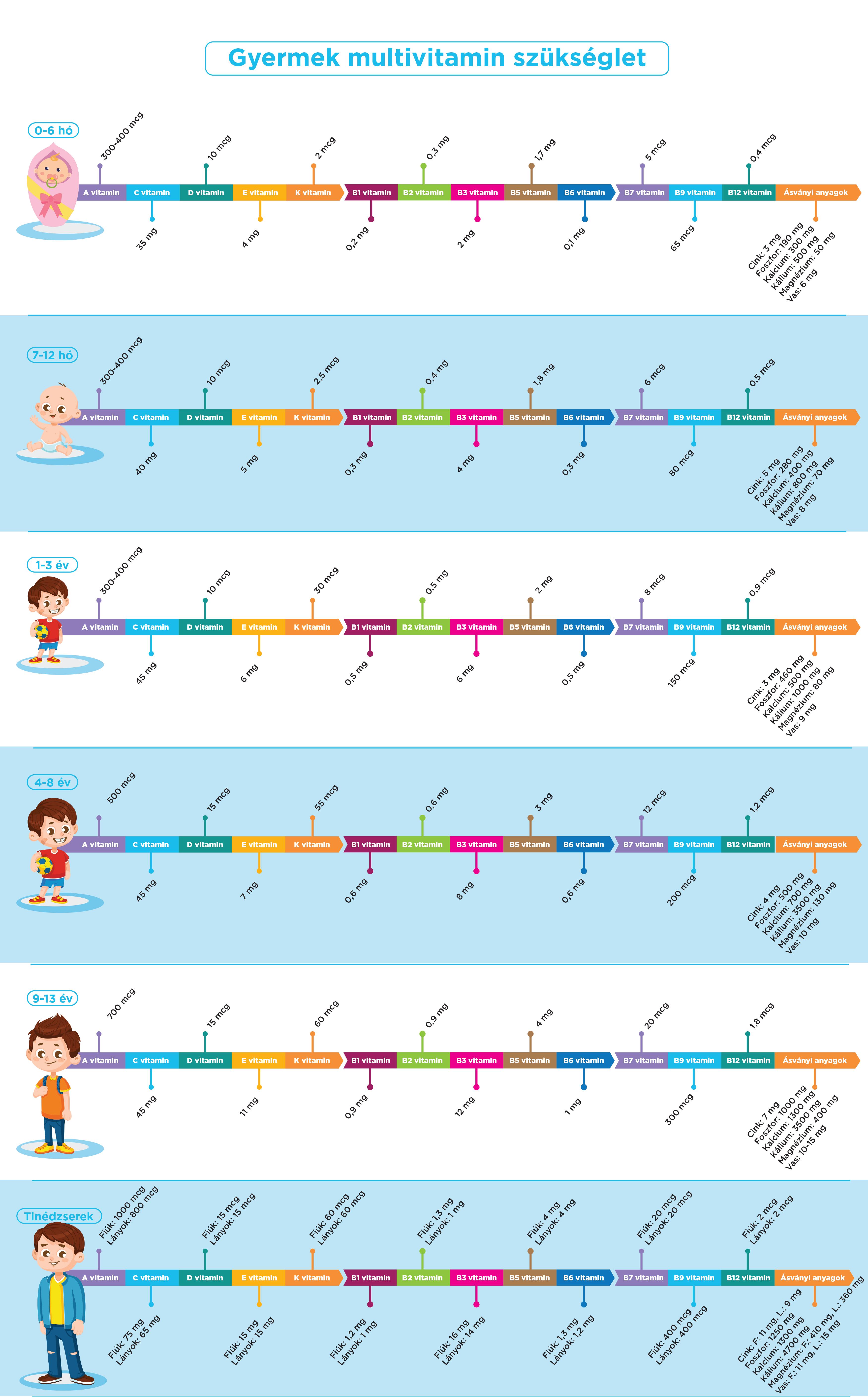 A D-vitamin egy kicsit kilóg a sorból, ott egy éves korban 10 mcg a napi szükséglet, majd 2 éves kortól egészen tinédzser korig 15 mcg marad ez az érték.